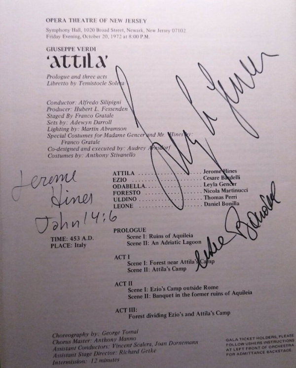 Before Newark, Hines had sung Attila only in Buenos Aires (1966), and reportedly in the decade after Newark he told American impresarios that he would go anywhere to sing the role. And so, he did, notably to Philadelphia (1978), Edmonton (Canadian premiere, 1978), Memphis (1979), and Chicago (1980). In Philadelphia the critic for the Inquirer welcomed the opera as "a reminder of how much intriguing music lies outside the usual operatic choices." In particular, he was impressed by Verdi's orchestral touches not only for Odabella's romanza but more generally for the "storm music, sea sounds, and forest murmurs." At Edmonton, a critic for the Albertan, was less enthusiastic, concluding that to hear the opera "once was a pleasure and a privilege; more is unnecessary." And after the Chicago premiere a local critic