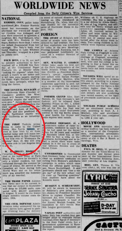 Un journal du soir a publié des détails intéressants sur l’arrivée de la grande artiste de l’Opéra National d'Ankara Mme Leyla Gencer, qui a été engagée, pour six semaines, par l'Opéra de San Francisco. Elle chantera ensuite au Métropolitain Opera de New York, ce qui est un événement artistique considérable.