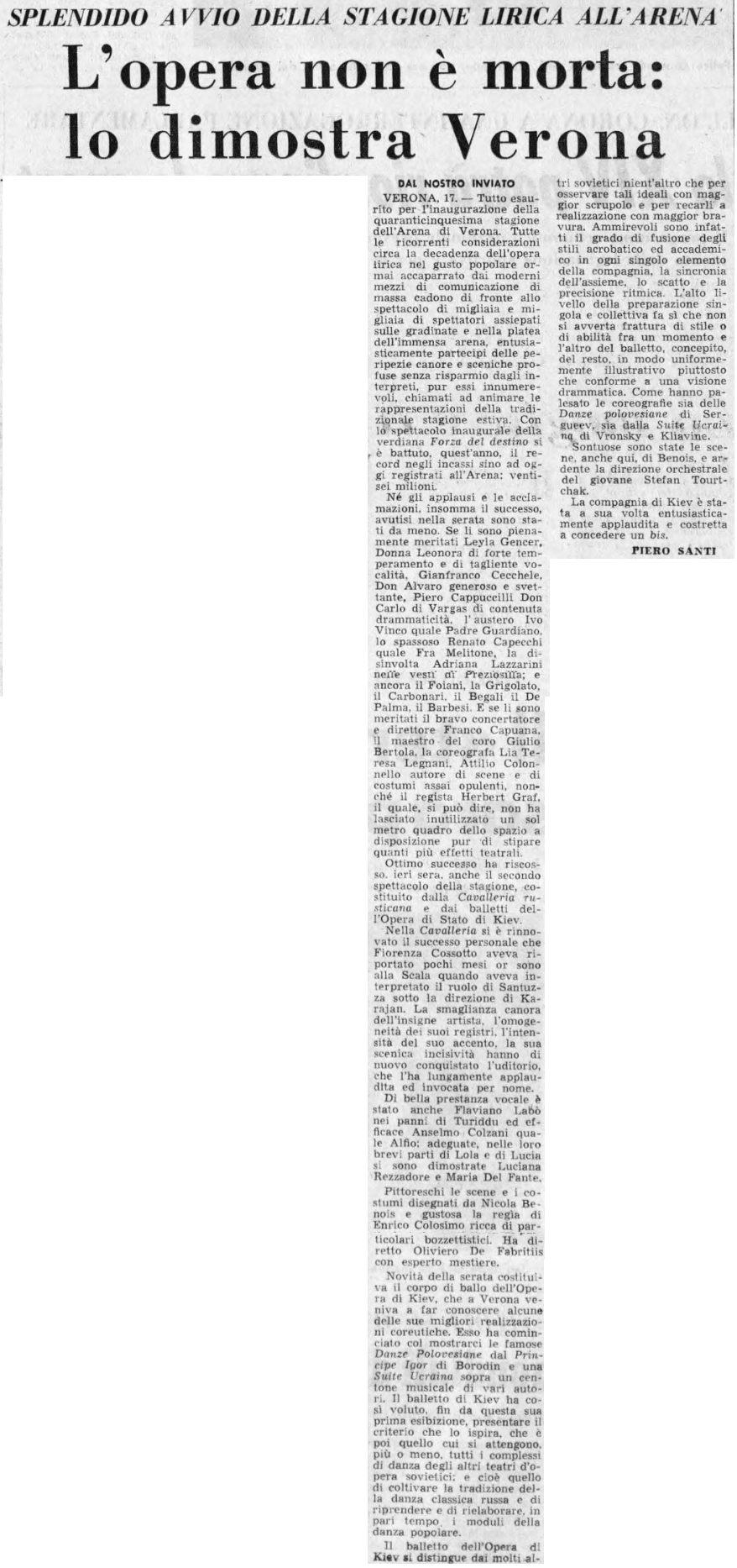 Assai lodata la presenza della Gencer nella Messa da requiem di Verdi, il 9 agosto 1966, sotto la direzione di Antonio Votto. Il fatto di essere un soprano drammatico di agilità le permetteva di passare nel "Libera me Domine" con grande facilità dai momenti della paura del castigo ai momenti della fiducia nella divina misericordia. Era presente in quell'anno anche nell'Aida con Bergonzi e la Cossotto, tre voci eccezionali per una buona direzione di Capuana e una bella regia di Herbert Graf. Non mancava come elemento di discussione l'intervento spettacolare del Corpo di Ballo del Teatro Kirov di Leningrado.