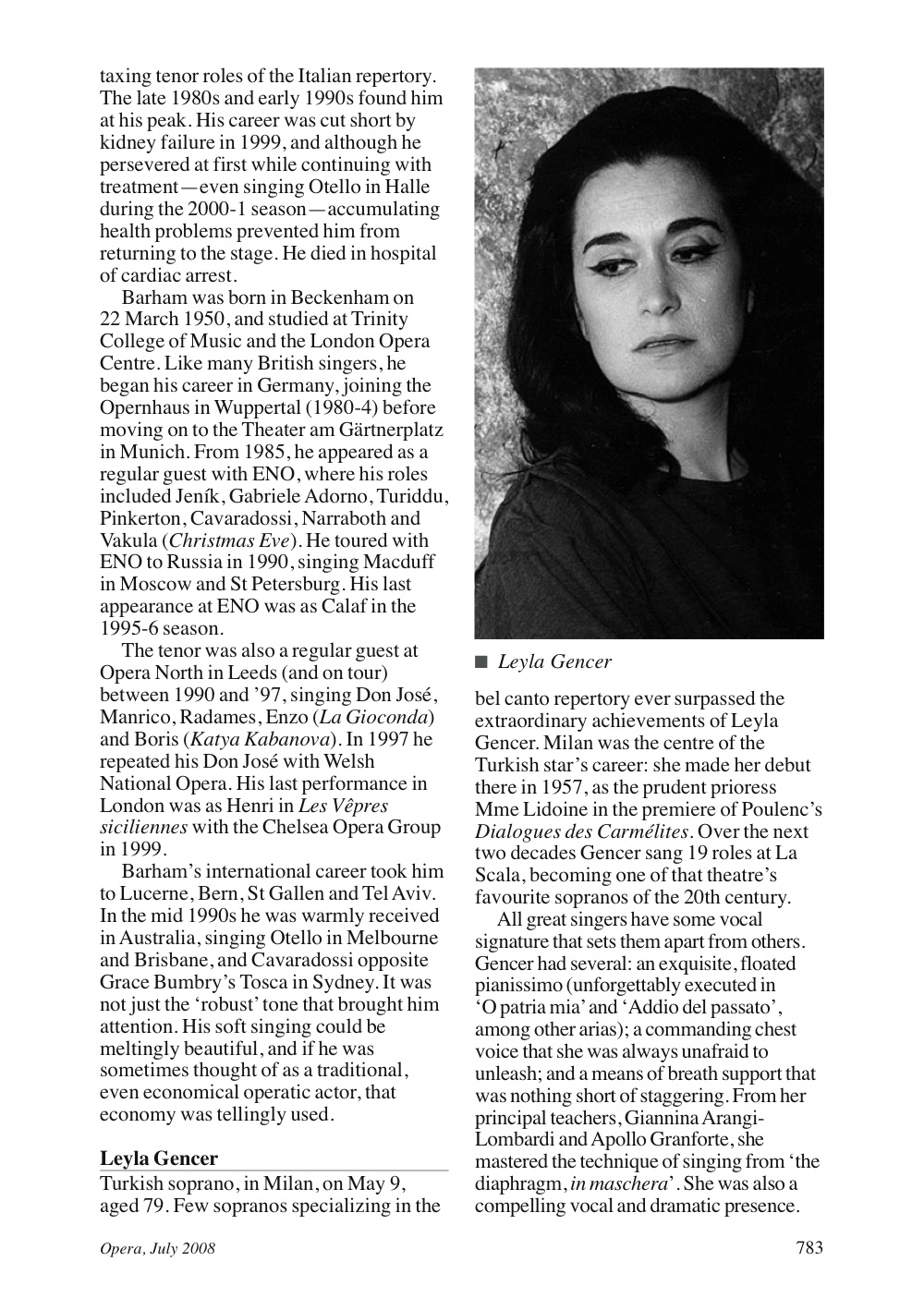 Leyla Gencer era nata a Costantinopoli nel 1928. Terminati gli studi al conservatorio della città turca, si perfeziona con il soprano Giannina Arangi-Lombardi e più tardi con Apollo Granforte. Debutta nel 1950 all’opera di Ankara nel ruolo di Santuzza in Cavalleria rusticana. L’esordio in Italia risale al ’53, quando interpreta il medesimo personaggio al San Carlo di Napoli. Il 26 gennaio 1957 è alla Scala nel ruolo di madame Lidoine nei Dialoghi delle carmelitane di Poulenc, opera presentata in anteprima mondiale. Dotata di un timbro adamantino e di una presenza scenica notevole – al punto che in molti la paragonarono alla Callas – la Gencer fu presto "adottata" dall’esigente pubblico milanese, interpretando nel corso di quindici stagioni, fino al 1983, diciannove ruoli, fra i quali Leonora ne La forza del Destino nel ’57, Elisabetta di Valois nel Don Carlo a più riprese fra il ’61 e il ’70, e poi Aida, Lady Macbeth, Norma. Fu anche la Donna di Canterbury nell’Assassinio nella cattedrale di Ildebrando Pizzetti, un’altra anteprima mondiale, andata in scena nel teatro del Piermarini nel 1958. Abbandonata l’opera nei primi anni Ottanta, fu indirizzata all’insegnamento da Riccardo Muti, divenendo in seguito direttrice dell’Accademia di canto scaligera e proseguendo l’attività concertistica fino ai primi anni Novanta.