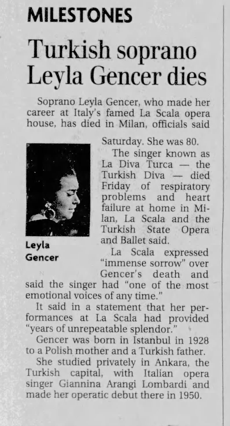Ankara Turkey (AP)—Soprano Leyla Gencer, who made her career at Italy's famed La Scala opera house, has died in Milan, officials said Saturday. She was 80.