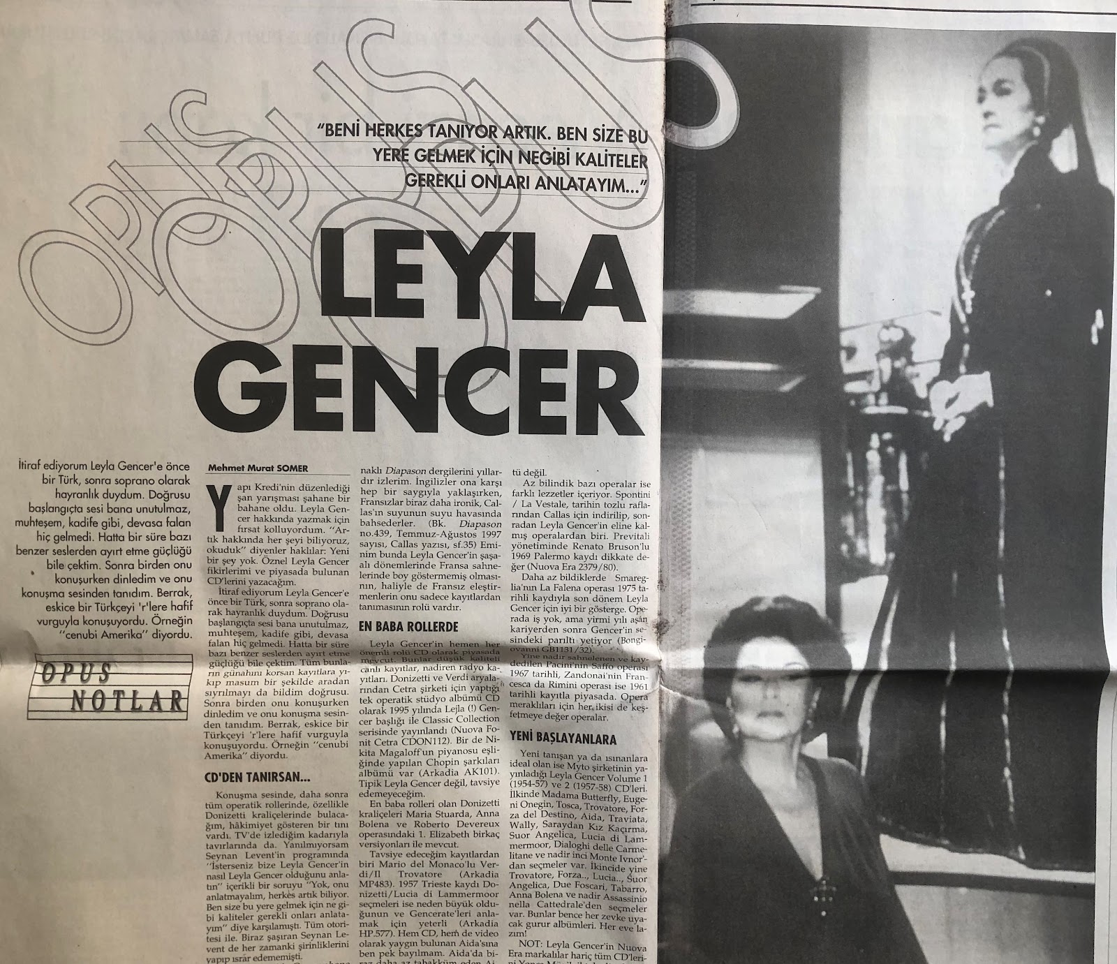 Leyla Hanımla 1982 yılının Temmuz ayında Doğan Hızlan’la birlikte bir konuşma yapmışız. (“Leyla Gencer ile Herşey Üstüne” Cumhuriyet 8-9 Temmuz 1982) Konuşmanın bir yerinde bakın sanatçı ne diyor.